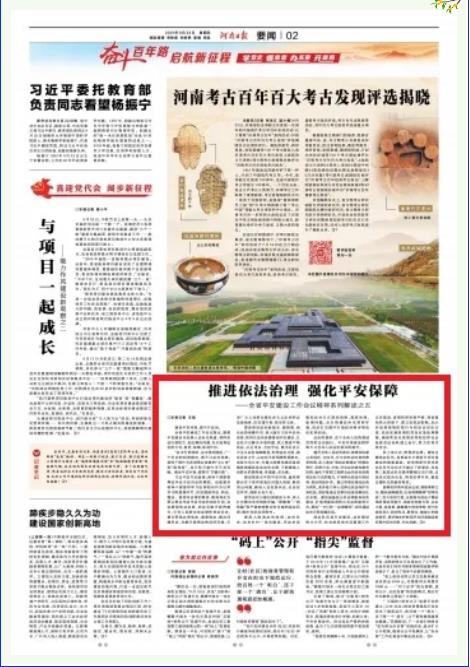 9月9日召开的全省平安建设工作会议,从关口前移、工作下沉;依靠群众、服务群众;主动化解、源头防范;控新治旧、标本兼治;依法治理、公正规范;加强领导、压实责任等六个方面,对建设更高水平的平安河南、加快推进社会治理体系和治理能力现代化作出了全面安排。深入理解、准确把握会议精神,推动平安建设各项部署落到实处、见到实效十分必要。今日,刊发全省平安建设工作会议精神系列解读之五《推进依法治理 强化平安保障》,敬请关注。