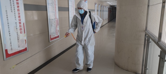 后勤保障是生命补给线,是打赢战疫的前提。后勤服务中心及时调配车辆、安装帐篷、接电供暖等全方位为抗疫一线的干警做好防护屏障。为阻断疫情传播,避免交叉感染,在院内开展无死角全面消毒。安排专人每日对全院进行消毒和安全排查,对院机关立案大厅、安检大厅、楼梯、卫生间、会议室等公共区域,尤其是办公室门按钮、楼梯扶手、洗手池、垃圾桶等进行重点消毒处理,并形成每日消毒记录,真正做到全方位、无死角。