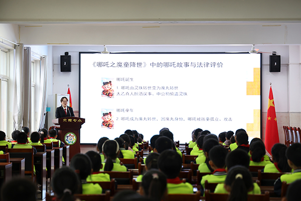 为进一步加强校园法治建设,提升未成年人的法治意识和观念,10月10日下午,荥阳市人民法院法官助理裴净净作为荥阳市第七小学法治副校长,以电影《哪吒之魔童降世》为切入点,将法律知识与影视剧情相结合,为100多名学生带来了一堂生动有趣的开学“普法第一课”。