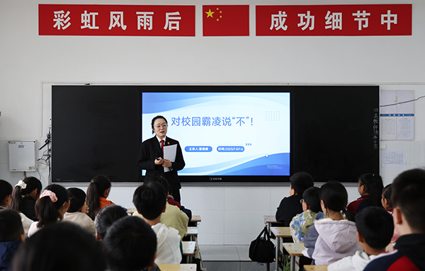 “面对校园霸凌,每一个人都不是旁观者,作为同学,要勇敢地运用法律手段,捍卫自己和同学的合法权益。”10月16日上午,荥阳市人民法院法官曾涵睿以荥阳市万山路小学法治副校长身份走进五(1)班,给学生们带来了一场别开生面的拒绝校园霸凌专题法治课,提升学生们的法治素养与自我保护能力,营造安全、和谐、健康的校园成长环境。