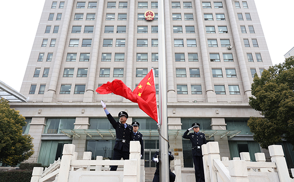 上午9时,全院干警在办公楼前整齐列队,精神饱满地参加仪式。司法警察迈着铿锵步伐护送国旗入场,伴随着激昂的《义勇军进行曲》,鲜艳的五星红旗冉冉升起,迎风飘扬。全院干警肃立注目、齐唱国歌,目光中饱含对祖国的深情祝福,胸前的法徽在朝阳下熠熠生辉,心中激荡着司法守护公平正义的使命豪情。
