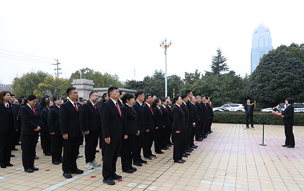 仪式结束后,马玲霞院长代表院党组向辛勤付出的全院干警,致以诚挚的新年问候。她指出,刚刚挥别的2025年,全院干警坚守法治信仰,紧紧围绕“公正与效率”工作主题,恪守法治初心,忠诚履职担当,在执法办案、司法为民、改革创新、队伍建设等各方面取得了扎实成效,为辖区经济社会高质量发展提供了有力的司法服务和保障。2026年是“十五五”规划的开局之年,使命在肩,更须奋力向前。要紧紧围绕大局履职尽责,以高效司法护航高质量发展,以温情司法回应民生关切,让公平正义更加可感可触、直抵人心。要继续保持昂扬向上的斗志,发扬脚踏实地作风,以“开局即冲刺”的姿态,团结一心、锐意进取,用奋斗书写司法为民新篇章,以实绩为法治建设增添新光辉!