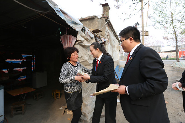 4月2日下午,荥阳法院党组成员、副院长史军带领执行局相关干警将案件执行款送到农村留守妇女张文华的手中。